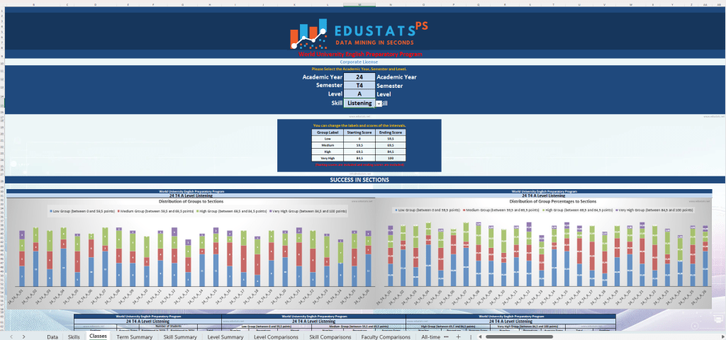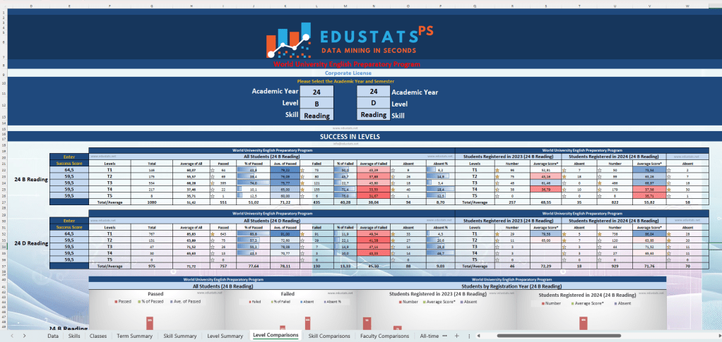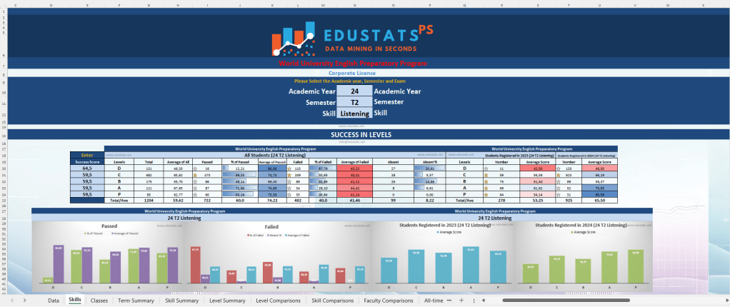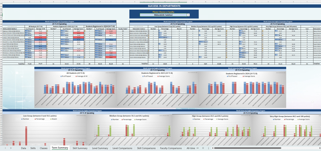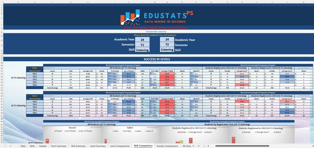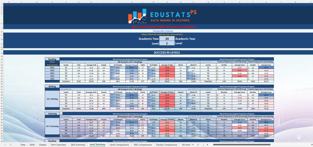 💡 Achievement statistics for skills (Reading, Listening, Writing, Use of English, etc.), absenteeism, and grade averages by student groups (all/first year/second year) and levels; number of absent students by term, level, and class; achievement statistics excluding absentees